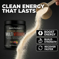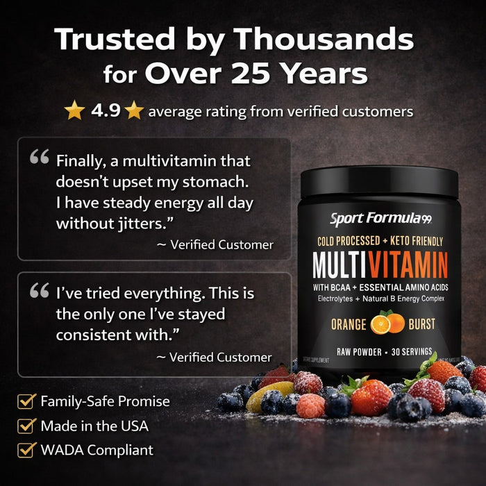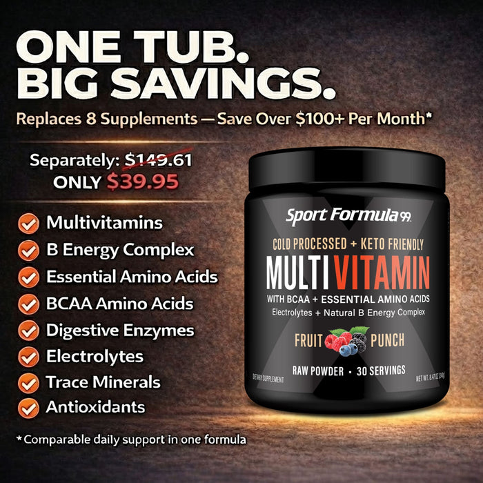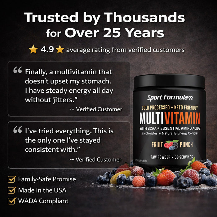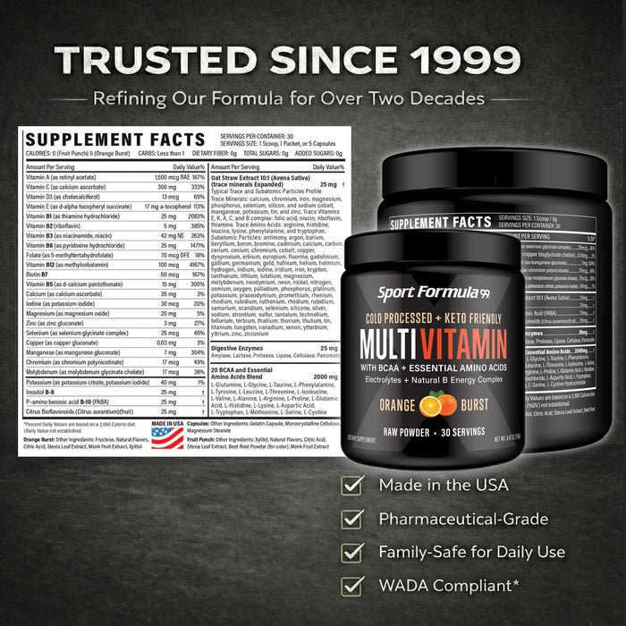 You will get what you want faster with Sport Formula’s Cold processed, Raw Powder Multivitamins with BCAA and Essential Amino Acids, Digestive Enzymes, Trace Minerals, Anti-oxidants, Electrolytes, Super Vitamin B Energy Complex and Multi-mineral blend. A full spectrum blend of U.S. Pharmaceutical grade nutrients that complete your body chemistry so your metabolism functions properly, feels like a real boost in your health. Family safe promise, used by Olympic athletes. Burn 30% more calories, use 30% more protein instead of wasting it. Powder Multivitamin 30 day supply - 30 level scoops in a jar (Powder settles to ⅓ full).